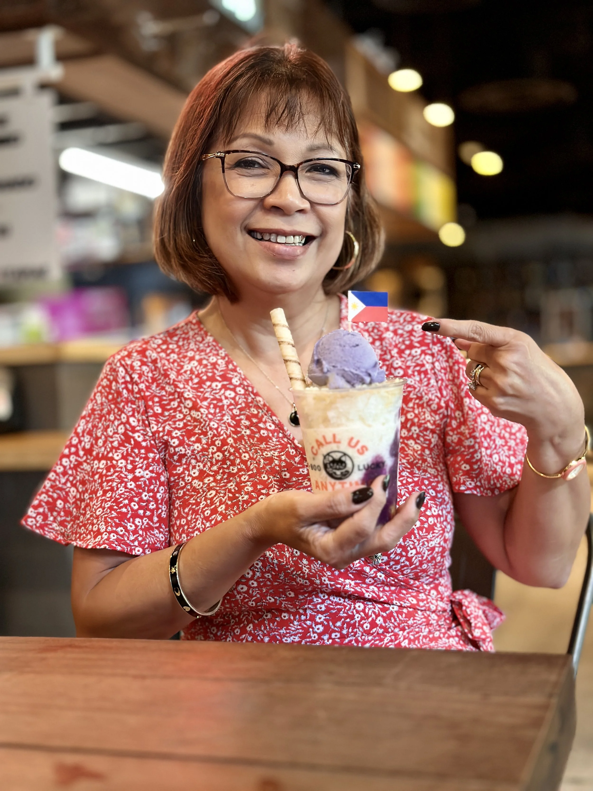 Joy indulging in Halo-Halo, a Filipino favorite snack.